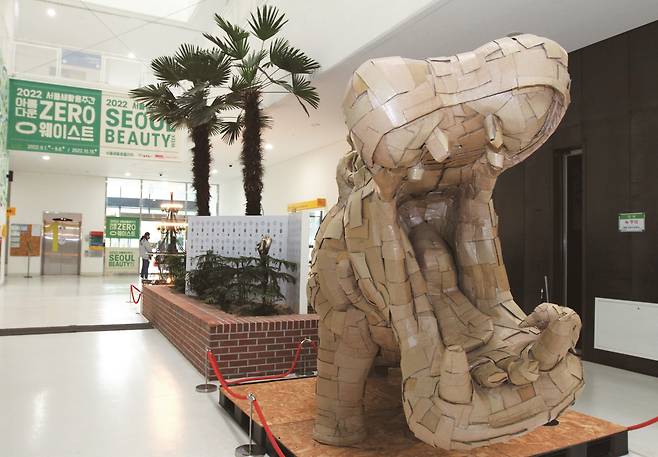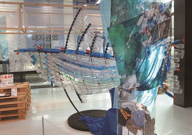 로비에 들어서면 샹들리에와 하마가 방문자를 맞이합니다. 하마는 다 쓴 종이 상자로 만들었습니다. 입 안은 물론 앙증맞은 꼬리까지 사실적으로 표현했습니다. 캐나다 작가 로렌스 발리에르가 만든 작품으로 자연과 인간의 ‘공생’을 표현하고 있습니다. 천장에는 빈 병을 활용한 샹들리에가 멋스럽게 달려 있습니다. 버려진 자원으로 만든 새활용 작품에 감탄사가 나옵니다.