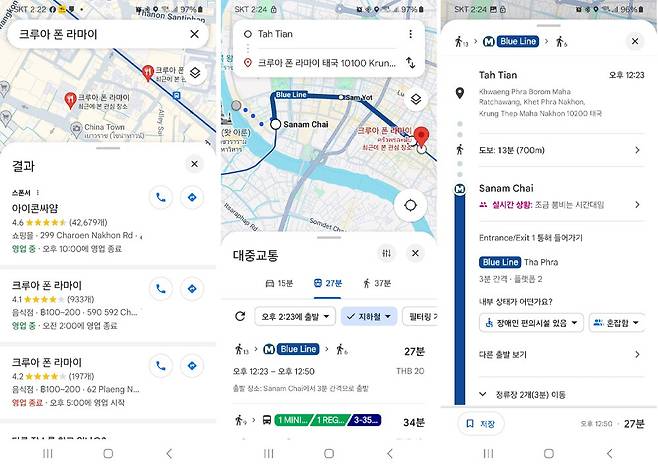 사원 투어를 마치고 배를 타고 다시 강을 건넌 후 점심을 먹을 식당을 찾다 백종원이 추천한 랏나를 먹어보기로 하고 차이나타운에 있는 크루아 폰 라마이 식당으로 이동했습니다. 구글 지도에서 크루아 폰 라마이 식당을 검색해 보니 2곳이 나와 도로변에 있는 곳을 찍고 출발했습니다.