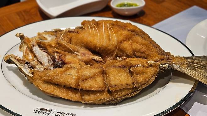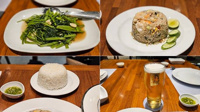 호텔로 다시 돌아온 후 잠시 더위를 식히고 저녁을 위해 농어 튀김으로 유명한 램짜런 씨푸드 센트럴월드점에 걸어서 다녀왔습니다. 램짜런 씨푸드 식당은 체인점으로 여러 곳에 있는데 가장 가까운 센트럴월드 3층에 있는 곳에서 저녁 식사를 했습니다. 이미 한국분들에게 농어 튀김으로 정평이 나 있는데, 고급 쇼핑몰에 입점한 식당으로 태국 일반 음식점보다는 가격이 비싼 곳입니다. 농어 튀김, 모닝글로리, 새우볶음밥, 공깃밥, 싱아 맥주 2잔을 주문했는데 1,335밧(약 51,250원 정도)이 나왔습니다. 볶음밥은 먹어본 볶음밥 중 손꼽히는 맛이며, 농어 튀김은 너무 맛있었고, 모닝글로리는 누구나 좋아하는 맛이었습니다. 맛있는 음식에 싱아 맥주 한 잔 마시니 기분이 너무 좋았습니다.