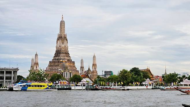 왓 아룬은 짜오프라야와 강을 건너면 바로 있습니다. 방콕과 짜오프라야강을 대표하는 상징물로 새벽 사원이라고도 합니다. 5밧을 내고 배로 강을 건너면 바로 맞은편 왓 아룬 선착장에 도착합니다.
