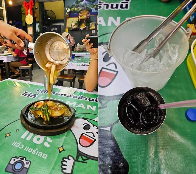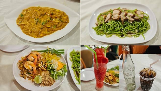 메뉴는 푸팟퐁커리, 새우볶음면, 돼지고기 튀김과 태국 공심채, 공깃밥 대짜, 땡모반, 콜라입니다. 어제 공깃밥 작은 건 너무 작아서 대짜를 시켰더니 공깃밥이 양푼에 가득 담겨 나와 좀 놀랐습니다. 중간이 없네요. 총 922밧이 나왔는데 SKT 멤버십 10% 할인 적용받았습니다. 음식은 한국인 입맛에 딱맞고 맛도 좋았습니다.