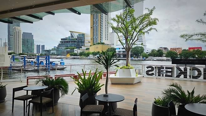 딸랏너이 골목을 돌아본 후 리버시티 1층에 있는 짜오프라야강 풍경 맛집인 스타벅스에서 더위도 시킬 겸 커피 한잔했습니다. 강 맞으편 아이콘싸얌으로 가기 위해 리버시티 건물 옆 선착장에서 배를 타고 강을 건넌 후 아이콘싸얌으로 갔습니다. 아이콘싸얌은 유명한 대형 쇼핑몰로 지하에는 실내 야시장인 쑥싸얌이 있습니다.