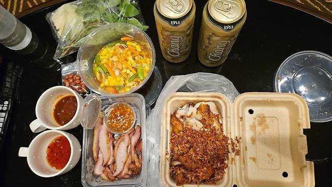 호텔로 돌아온 후 Grab 앱으로 배달 음식을 시켜 먹었습니다. 치킨 맛집인 재키 프라이드치킨에서 마늘 플레이크 치킨, 커무양, 옥수수 쏨땀을 시키고 편의점에서 맥주를 사와 함께 먹었습니다. 검색은 태국어로 ไก่ทอดเจ๊กี -ลุมพินี라고 검색하거나 영어로 Polo fried chicken을 검색하면 됩니다. 배달비 포함해서 385밧(약 만오천 원) 들었습니다. 시원한 호텔 방에서 TV를 보며 맛집에서 배달돼 온 음식을 맥주 한잔과 함께 먹으니 피로가 싹 풀립니다.