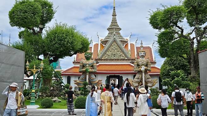 비행기 연착으로 새벽에 도착한 후 호텔에서 바로 잠들고 다음날 첫 일정을 시작했습니다. 첫날은 그랩 택시를 타고 왕궁으로 향했습니다. 택시에서 내려 왕궁 매표소로 향하고 있는데 관광 경찰로 보이는 사람이 오늘은 왕궁 외국인 관람이 끝났다고 다른 투어를 권유합니다. 투어는 사양하고 원래는 왕궁과 왓 포 일정이었으나 긴급 변경하여 왓 포 방문 후 왓 아룬까지 가기로 변경했습니다. 이때는 몰랐지만, 왕궁은 열려있었으며 비싼 투어로 피해를 입었다는 후기를 귀국 후 보게 됩니다.