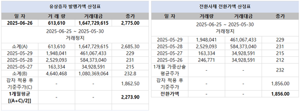 이 같은 가격 차이는 이사회 결의일 시점에서 비롯됐다. 유상증자는 이달 27일 이사회에서 결의했지만 CB 발행 안건은 그보다 하루 전인 26일 다뤄졌기 때문이다. 1일 간격으로 시간차를 두고 결정함으로써 유상증자 신주 발행가액과 CB 전환가액 차이를 벌릴 수 있었던 것이다.