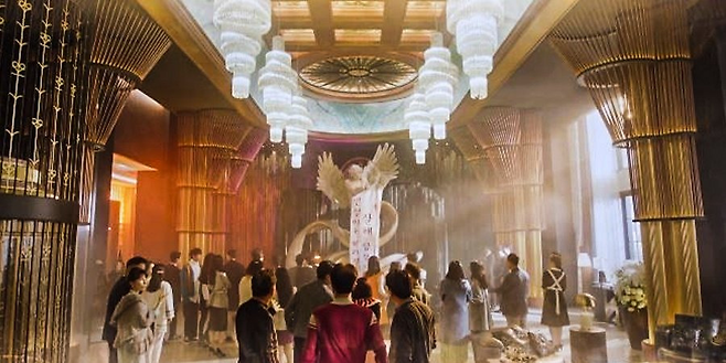그렇다면 화려한 로비와 조각상이 놓인 분수대 장면은 어디에서 촬영되었을까. 이 로비 장면도 경기도 파주에 마련된 세트장에서 찍었다고 한다. 드라마 속에서 유독 눈길을 끌었던 헤라 여신상 또한 작품의 콘셉트에 맞춰 맞춤형으로 조각된 것이다. 이 로비 한편에 위치한 분수대를 중심으로 주민들의 파티나 대립 장면이 자주 펼쳐져, 드라마 내 주요 무대 역할을 했다. 놀랍게도 실제 호텔 로비 같은 모습이지만, 세트장임을 알고 보면 제작진의 섬세한 디테일에 감탄하게 된다.