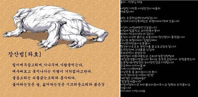 장산범이 실재한다고 가정할 때, 가장 먼저 비교되는 생물은 조선시대까지 한반도에 서식하던 호랑이다.