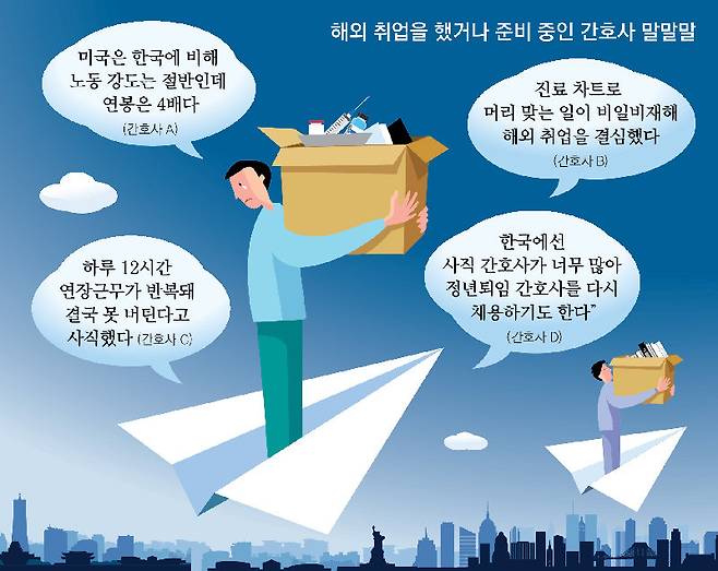 국내 간호사들이 해외 취업을 택하는 것은 국내 병원에서 수행하는 업무가 과중한 반면 처우는 상대적으로 열악하기 때문이다. 한국에서 2년간 신경외과 병동 간호사를 하다 지난해부터 호주 멜버른의 한 병원에서 일하는 이모 씨(33)는 “한국 병동에선 간호사 한 명당 한 번에 환자를 20명씩 담당할 때도 있었는데 호주에선 4명만 돌본다”며 “그만큼 환자 한 명에게 더 집중할 수 있고 업무 피로감도 적다”고 말했다.