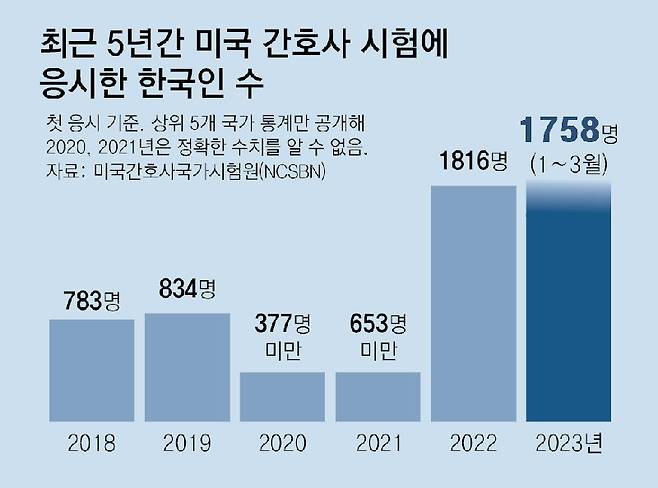 13일 동아일보가 입수한 미국간호사국가시험원(NCSBN) 자료에 따르면 지난해 미국 간호사 면허시험인 ‘엔클렉스(NCLEX)’에 응시한 한국인 수는 1816명에 달했다. 2018년 783명이었던 것에 비해 2배 이상으로 늘어난 것이다.