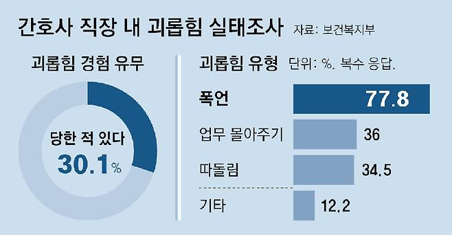 보건복지부가 지난해 7월 발표한 ‘보건의료인력 실태조사’에 따르면 간호사 중 직장 내 괴롭힘을 경험했다는 응답자가 30.1%나 됐다. 괴롭힘의 유형은 폭언(77.8%)이 제일 많았고, 업무 몰아주기(36%), 따돌림(34.5%) 순이었다.