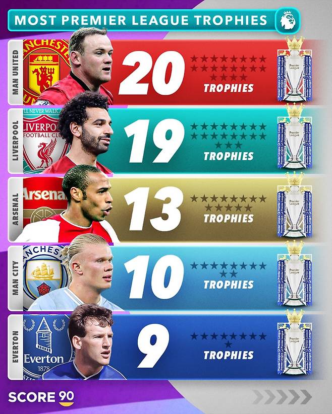 2위는 리버풀이다. 무려 19번 우승했다. 누적 승점 1위와 최다 승리 기록을 가진 팀이다. 이어 잉글랜드 구단 중 가장 많은 메이저 우승컵을 들어 트로피 진열장이 화려한 팀이다. '별들의 전쟁'일 불리는 유럽축구연맹(UEFA) 챔피언스리그(UCL) 우승 5회로 잉글랜드 클럽 중 가장 많이 우승했다.