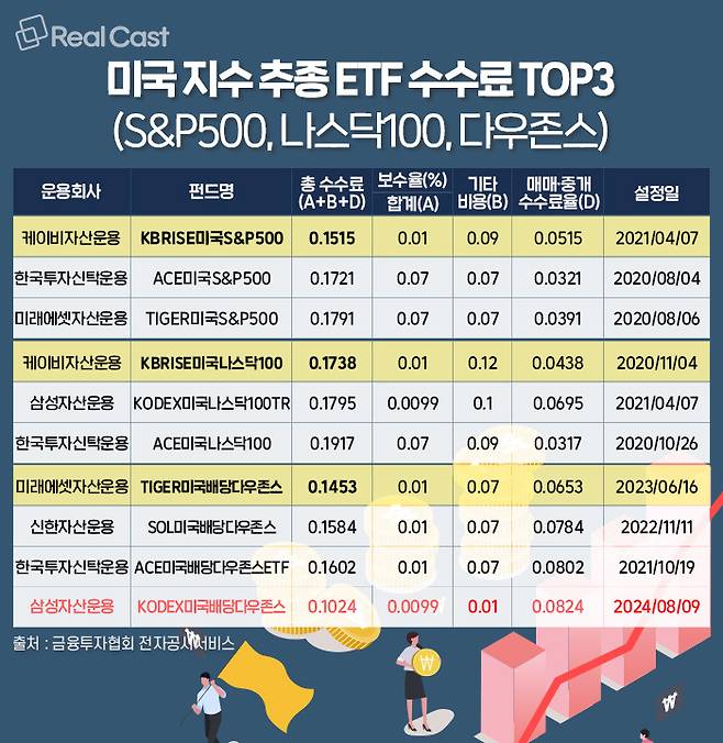국내 주요 ‘미국 지수 추종 ETF’의 운용보수 순위