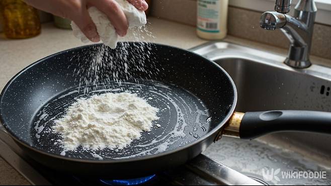 소금은 입자가 굵어 물리적으로 기름때를 긁어내는 효과가 크다. 전을 부친 뒤 남은 팬은 먼저 키친타월로 겉 기름을 닦아낸다. 그 위에 소금을 뿌려주고 젖은 수세미로 살살 문지르면 기름막이 서서히 떨어져 나온다. 거친 주물팬이나 무쇠팬에 특히 잘 맞는다. 기름때와 함께 냄새까지 제거되는 장점도 있다.