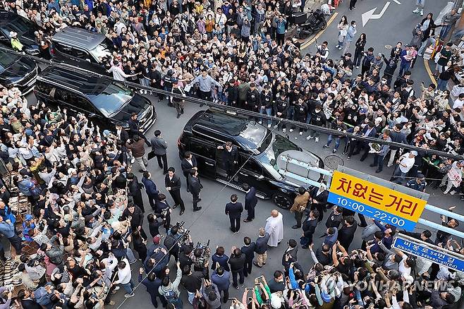 (진주=연합뉴스) 김도훈 기자 = 영남 신라벨트 골목골목 경청투어에 나선 더불어민주당 이재명 대선 후보가 10일 경남 진주시 대안동 차없는 거리를 찾아 차에서 내리며 시민들에게 인사하고 있다. 2025.5.10 [공동취재]