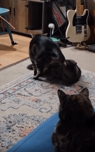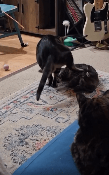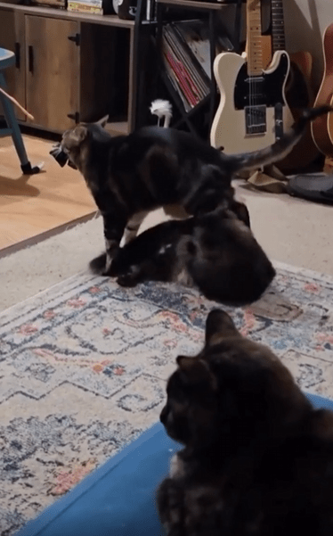 고양이는 당황한 얼굴로 강아지의 발을 앞발로 붙잡으려 애쓰지만, 강아지는 이미 다음 발차기를 준비한 상태. 애매한 거리 유지와 유연한 몸놀림으로 몇 차례 더 배를 차고는, 아무 일 없었다는 듯 꼬리를 흔들며 유유히 자리를 떠납니다. 그 뒷모습엔 ‘난 그냥 장난친 거야, 왜 그래?’ 하는 태연함마저 느껴졌어요.