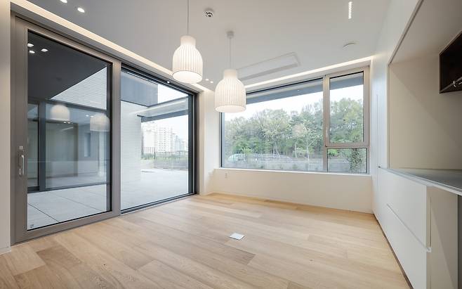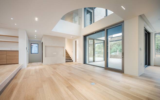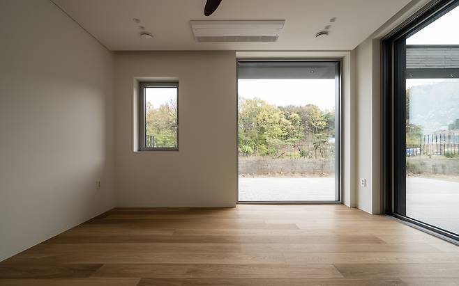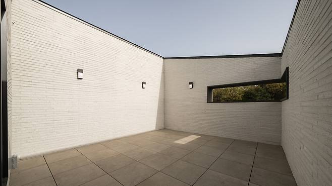 건물의 규모에 비해 대지는 좁은 편이었다. 이에 ‘ㄷ’ 형태의 배치를 계획하고 그 안에 작은 마당을 만들어 거실과 다이닝, 다목적실 등 집의 공간들과 마주하도록 했다. 그로 인해 시각적으로 각 실의 공간이 확장되기도 하지만 실제 사용함에 있어서도 공간 확장이 가능하다.