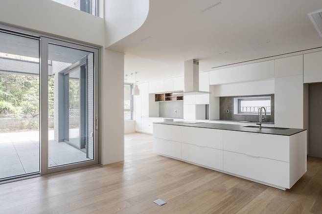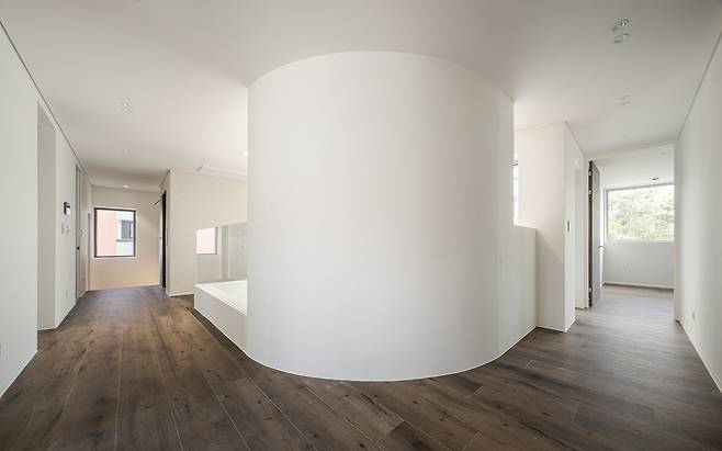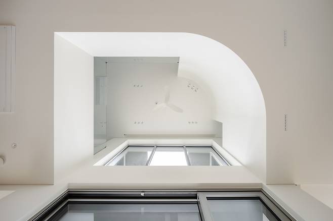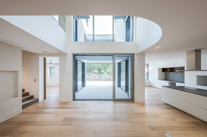 부부는 자녀들이 공부와 놀이를 하며 생활할 플레이룸을 만들되, 아내가 요리를 준비하거나 여가 시간을 보낼 주방공간에서 쉽게 플레이룸을 볼 수 있도록 설계해 달라고 요청했다. 또 손님을 맞이할 수 있는 공간과 함께 모든 단차를 없애 편안한 보행이 가능한 집으로 만들어 줄 것을 부탁했다. 우리는 거실과 결합된 플레이룸을 계획했고, 그 공간이 이 집의 중심이 되도록 했다. 중정과 정면으로 면한 거실과 플레이룸은 두 개 층의 실내 오프닝을 통해 개방감과 채광을 극대화하고 1층과 2층을 연결한다. 오프닝에 면해 설치된 2층의 부드러운 곡면은 2층 복도 동선을 자연스럽게 유도하며 1층 공간에 지루하지 않은 변화를 준다.