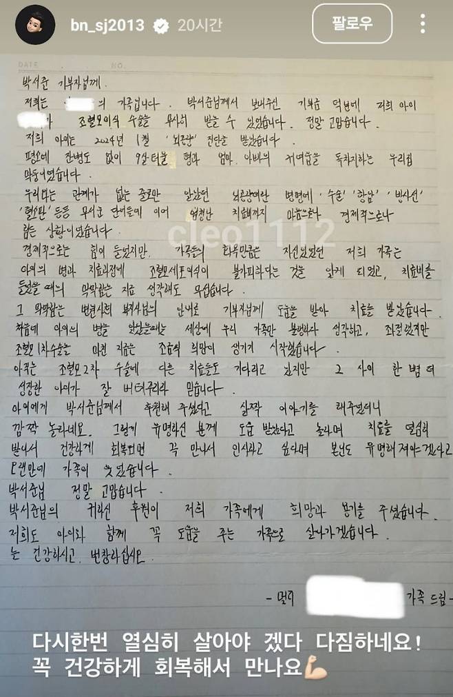조혈모세포 이식 수술은 막대한 치료비가 필요한데, 박서준 씨의 후원은 이 가족에게 큰 희망이 되었습니다. 그의 도움으로 아이는 무사히 수술을 마쳤고, 가족들은 감사의 마음을 담아 손편지를 작성해 박서준 씨에게 전달했습니다.