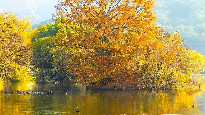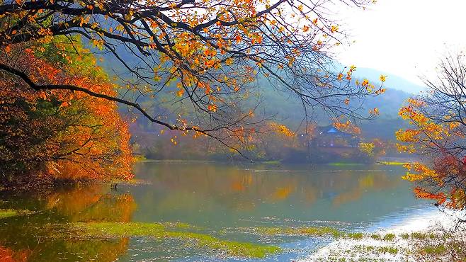 단풍으로 물든 수면, 고즈넉한 정자, 그리고 완만한 흙길. 여기는 누구나 걸을 수 있는 가을의 정수입니다.