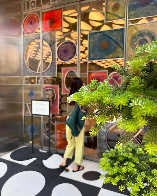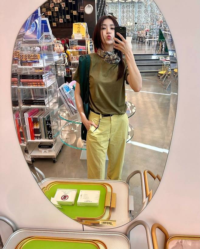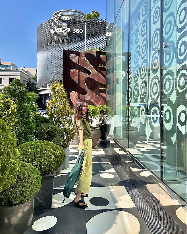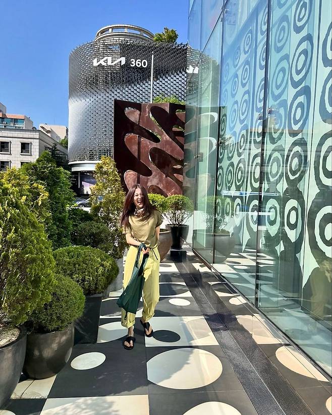사진 속 박하선은 카키색 롤업 반팔티와 노란색 팬츠를 입고 조리를 신었다. 에코백을 매치하여 캐주얼한룩을 선보였다.