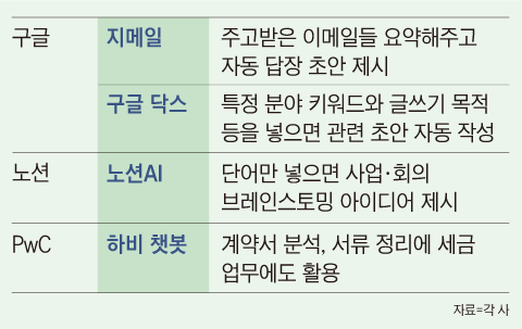 구글도 지난 14일 생성 AI를 기반으로 하는 구글 워크스페이스를 공개했다. 주고받은 이메일을 요약하고 답장 초안을 쓰거나, 문서를 자동 요약하고 주제어와 관련된 초안을 알아서 작성하는 것도 가능하다. 미국의 업무협업툴 업체 노션도 지난달 단어 하나만 입력하면 다양한 사업·회의 아이디어를 내놓는 노션AI를 공개했고, 채용 사이트 링크드인은 사용자가 회사명과 직무 정보만 넣으면 AI가 사용자의 프로필을 작성해 주는 기능을 내놨다. 글로벌 회계 컨설팅 업체 PwC도 스타트업 하비가 개발한 AI 챗봇을 활용해 계약서 분석과 세금 업무를 진행하는 프로그램을 실험 중이다.