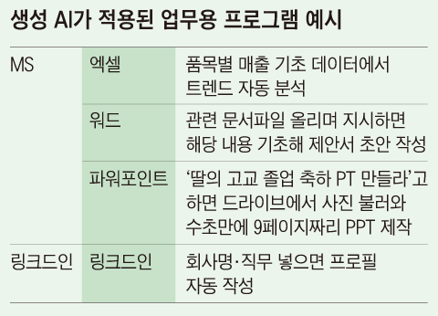 마이크로소프트(MS)와 구글, 업무협업툴 업체 노션, 비즈니스 인맥·채용 SNS 링크드인이 최근 이 같은 서비스를 잇따라 내놓고 AI 업무 혁신 시대의 물꼬를 텄다. 테크 업계에선 AI가 적용된 프로그램을 사용하는 사람과 그렇지 않은 사람 간의 생산성 차이가 갈수록 커질 것이라는 분석이 나온다. 미 IT 매체 더버지는 “이는 궁극적으로 일하는 방식을 완전히 바꿀 것”이라고 했다.