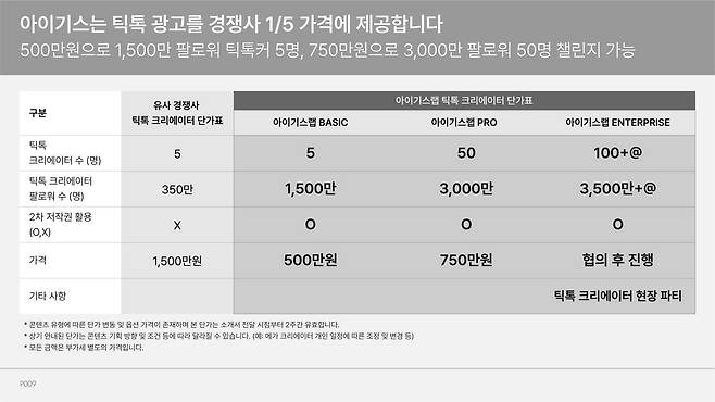 영프린스: 어떤 광고든지 광고주에게 그만큼의 효율을 제공해줘야 해요. 그런데 팔로워 많다고 다들 어깨만 올라가서 돈만 몇백씩 부르죠. 문제는 몇백만 팔로워 있어 봐야 다 허수인 크리에이터투성이거든요. 준 돈에 비해 효율이 떨어지니까 광고주들이 빠져버리는 상황이 돼 버린 거예요. 지금 틱톡커들 단가만 높지, 사실 광고 안 들어와서 한 푼도 못 버는 크리에이터 투성이에요. 마케터가 다들 틱톡커를 믿지 않게 된 거죠. 사실 올 초만 해도, 아이기스랩 말고는 틱톡커한테 광고를 줄 수 있는 데가 없을 지경이었어요.