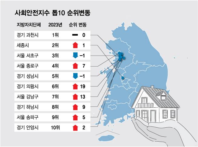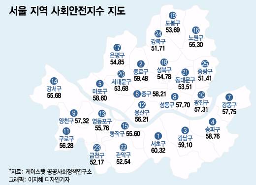 서울에서 사회안전지수가 가장 높은 자치구는 서초구(60.32점)였다. 정량지표(9위)와 정성지표(2위) 모두 최상위권을 기록하며 전체 3위를 차지했다. 특히 의료환경·주민 건강상태 등을 측정하는 건강보건 분야(66.75점)에서 전국 1위를 기록했다. 상급종합병원인 강남성모병원이 위치해 있고, 특화병원·개인병원 등이 많아 의료기관 접근성이 높기 때문으로 풀이된다.