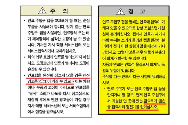 주유소에서 주유 후 차량의 주유구를 닫지 않고 주행하는 차들에도 간혹 발생하는 일이 있다. 엔진 경고등이 점등되는 것이다. 주유소를 나올 때 꼭 주유캡을 닫았는지 확인해 보는 것도 놓치지 말아야 할 요소이다.