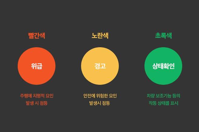 계기판 속 경고등의 색상은 크게 3가지로 나뉘어져 있다. 우리가 평상시 사용하는 전조등이나, 방향지시등 같은 경우 안전에 크게 위협이 되지 않기 때문에 초록색으로 점등되며, 주행은 가능하나 점검이 필요한 경우 주황색으로 점등된다. 대표적으로 엔진 경고등과 타이어 공기압 점검이 필요한 경우이다.