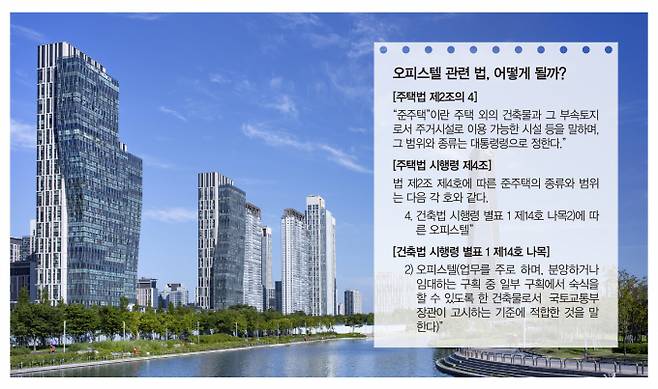 오피스텔은 업무와 거주를 주용도로 하는 건축물로 관련 법에 의한 정의는 다음과 같다.