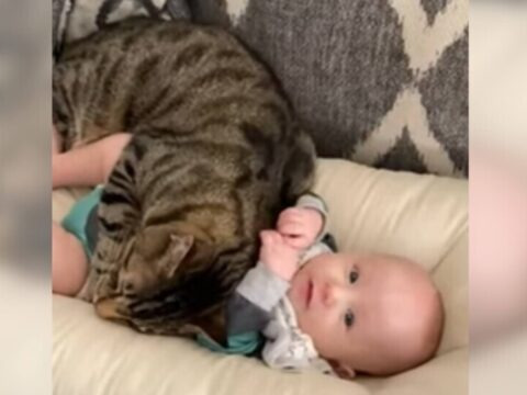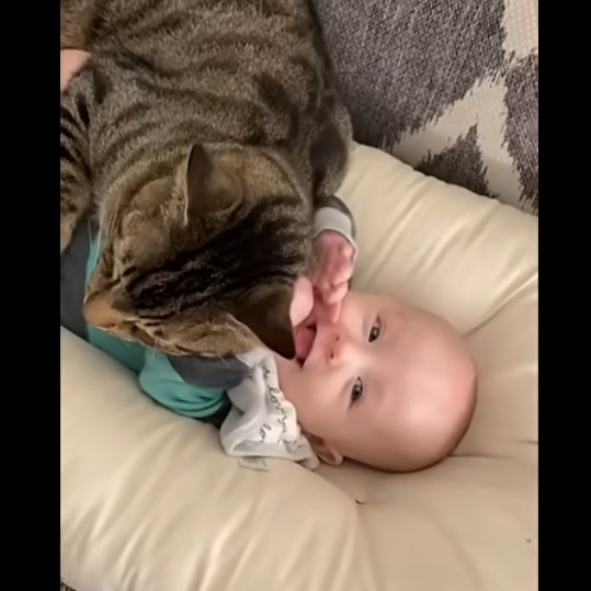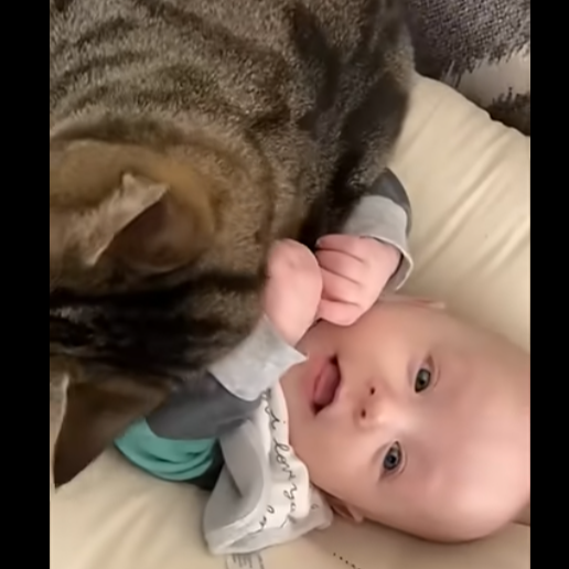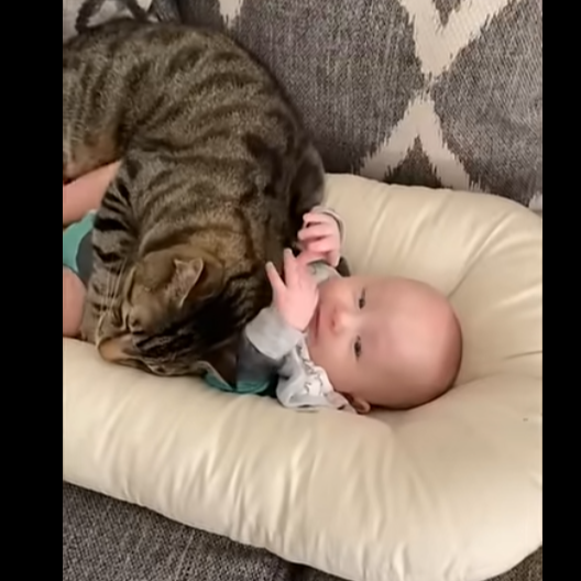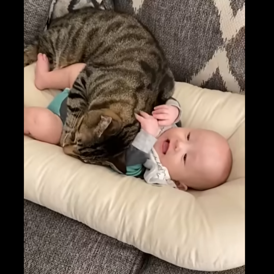 소파 쿠션 위에 있는 아기 곁에 큰 고등어 무늬 고양이가 안아주듯 바짝 붙어 있는 영상이 화제가 되고 있습니다. 아기는 기분 좋게 웃었습니다.