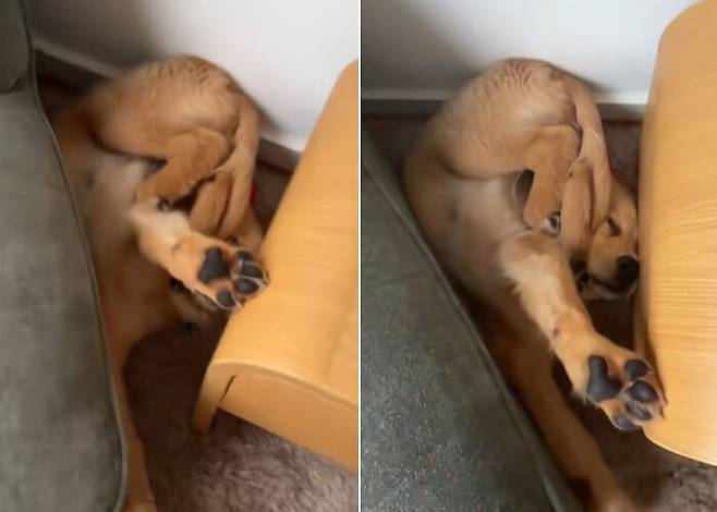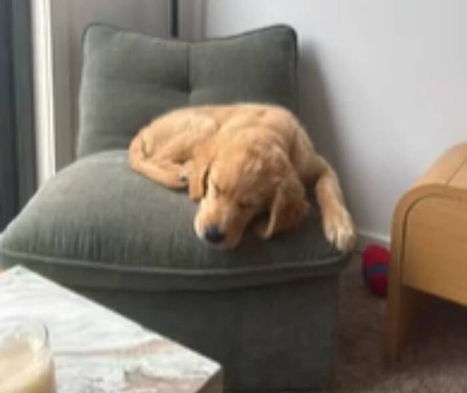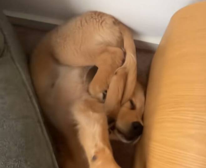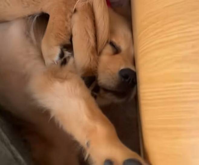 의자 위에서 곤히 자다 바닥으로 굴러떨어진 아기 골든 리트리버의 황당한 낮잠