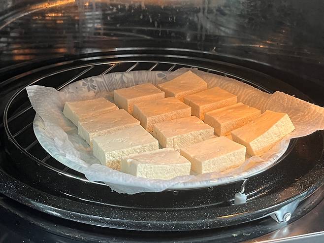 그다음 전자레인지에 넣고 약 3분을 조리합니다. 이 과정을 통해 두부의 수분이 날아가고, 질감도 쫀쫀해져 요리하기 훨씬 좋아집니다.