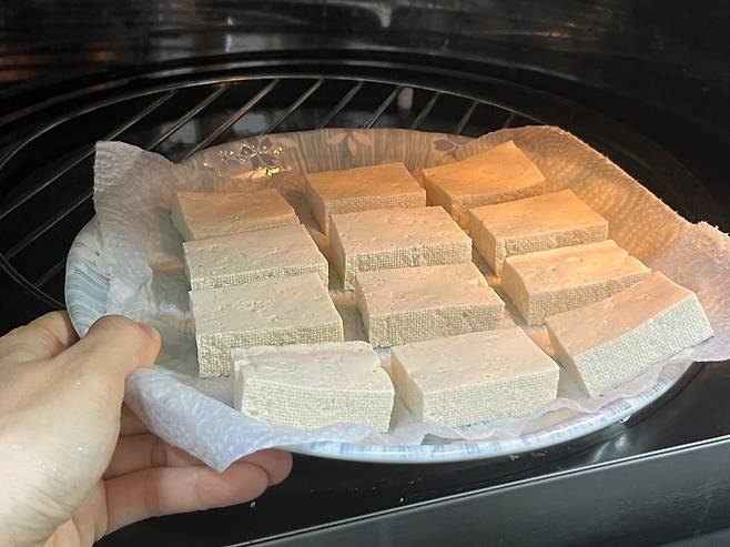 그다음 전자레인지에 넣고 약 3분을 조리합니다. 이 과정을 통해 두부의 수분이 날아가고, 질감도 쫀쫀해져 요리하기 훨씬 좋아집니다.