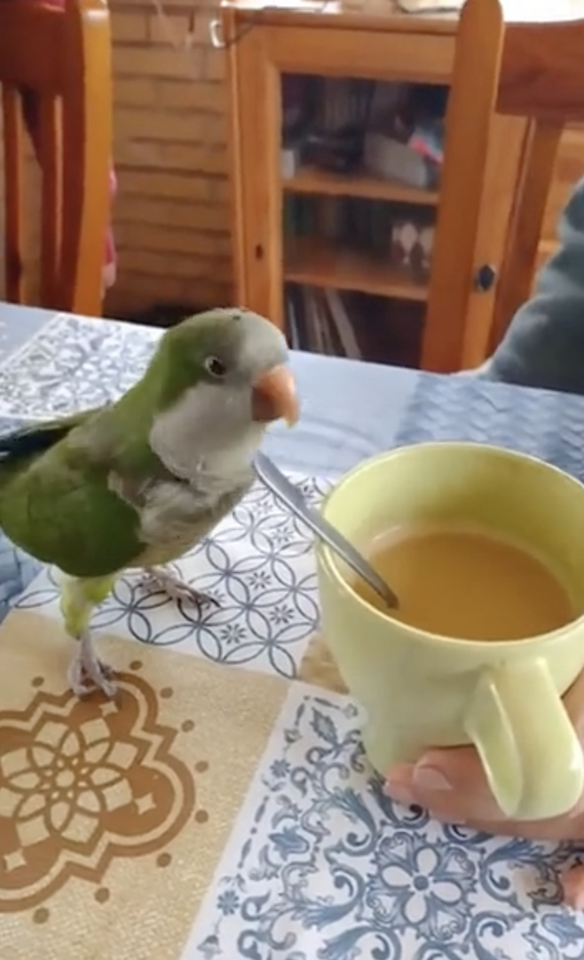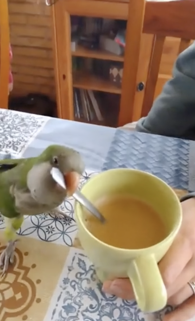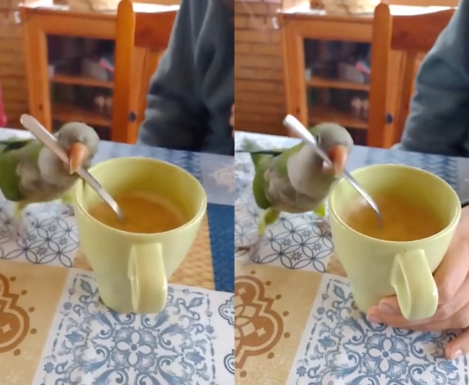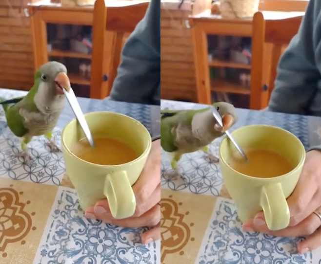 주인의 커피를 "쉐이킹"하는 앵무새의 재치 넘치는 행동