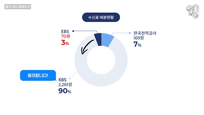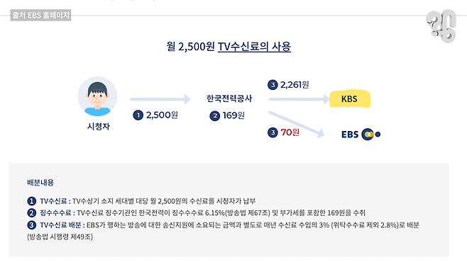 비율도 정해져 있는데 이 중 EBS에는 2.8%인 70원이 배정되고 수신료 징수기관으로 명시된 한국전력이 169원을 위탁수수료로 가져간다. 나머지...는? 239원 빼고 나면 2261원은 KBS가 가져간다.