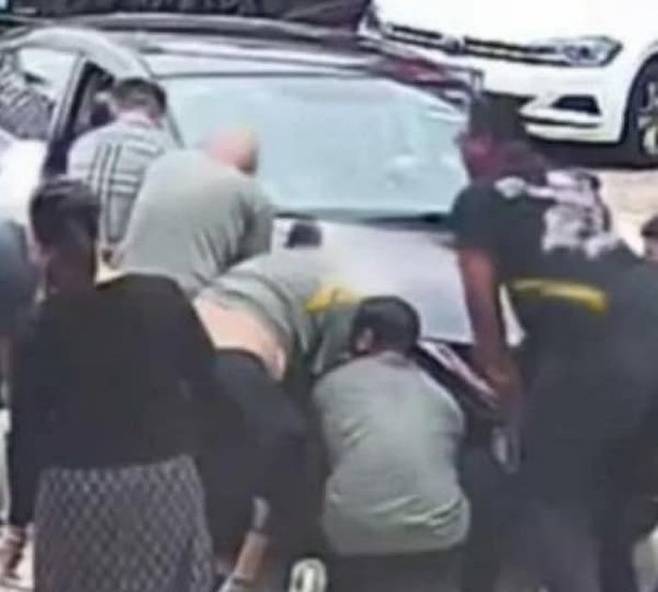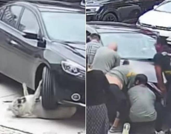 녀석의 낑낑 우는 소리에 놀란 동네 사람들이 모두 달려와 힘을 모아 차량을 번쩍 들어 올려서 골든 리트리버 강아지를 무사히 구해냅니다.