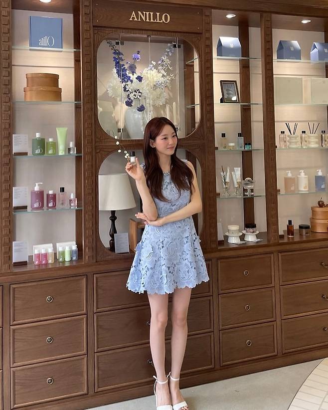 드레스는 플로럴 패턴의 입체감 있는 레이스 소재로 구성되어 고급스럽고 로맨틱한 무드를 자아낸다. 허리선을 살짝 강조한 A라인 실루엣은 우아한 페미닌룩의 정석을 보여주며, 짧은 기장감이 길고 곧은 각선미를 돋보이게 만든다. 특히 하늘빛 컬러는 여름 햇살 아래에서도 빛나는 그녀의 피부 톤과 조화를 이루며, 전체적인 스타일링에 청량한 느낌을 더한다.