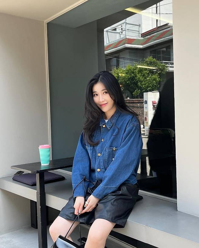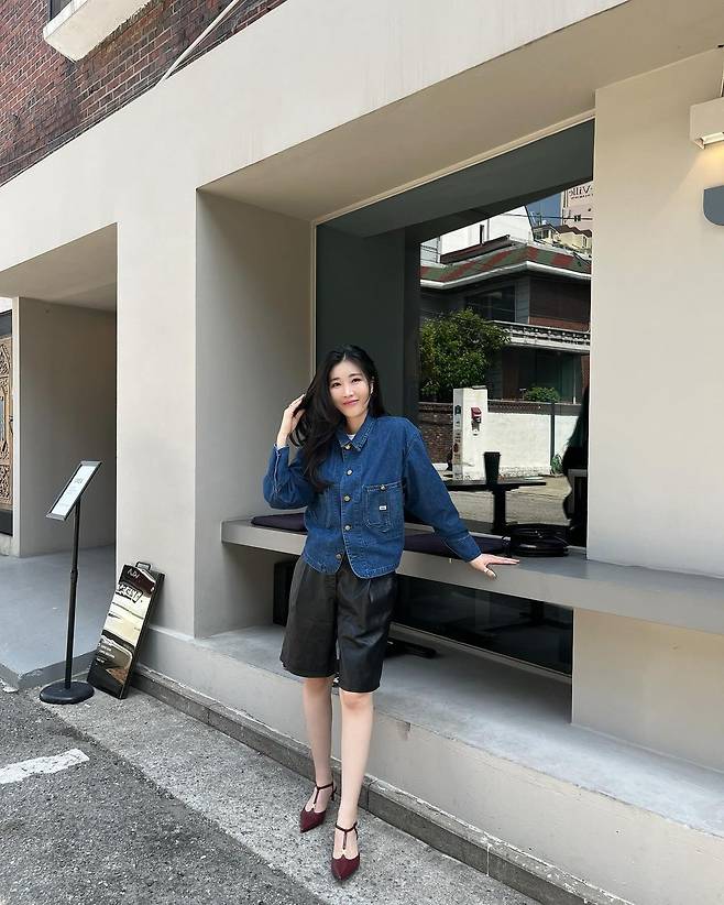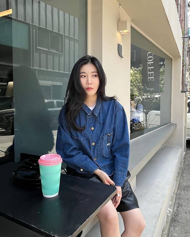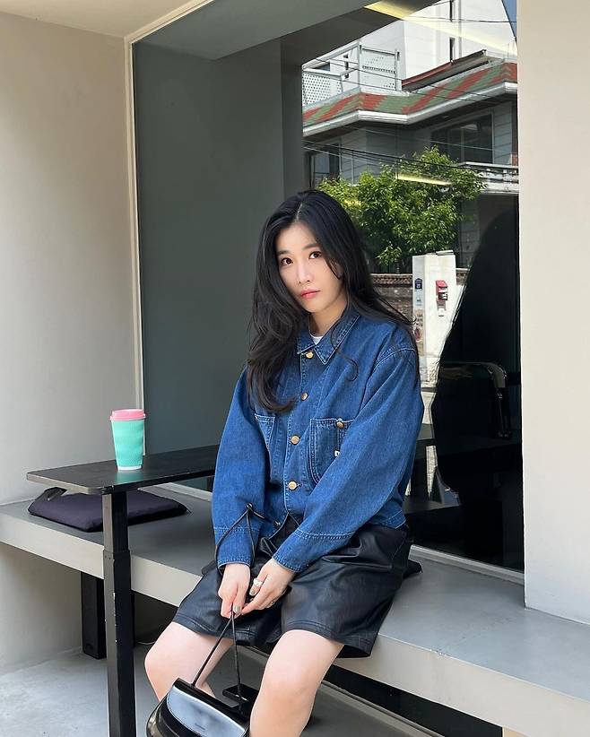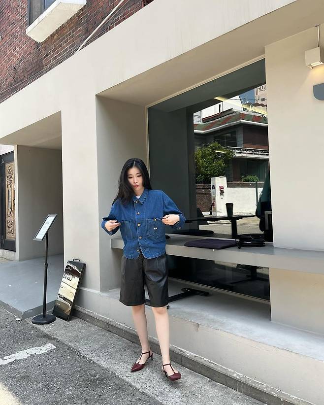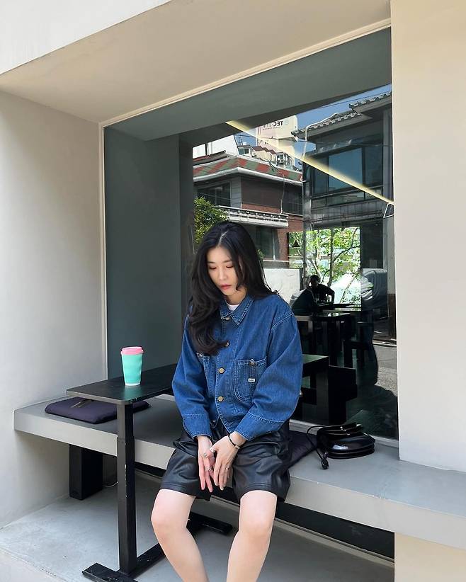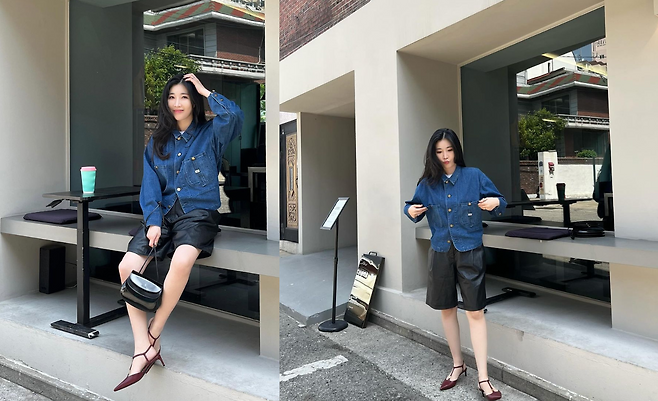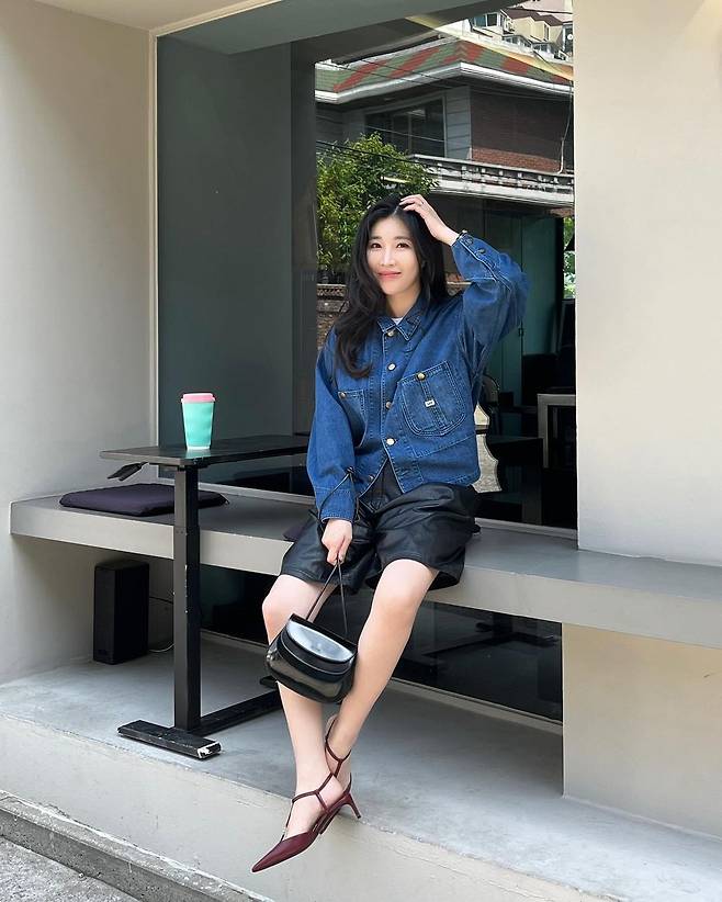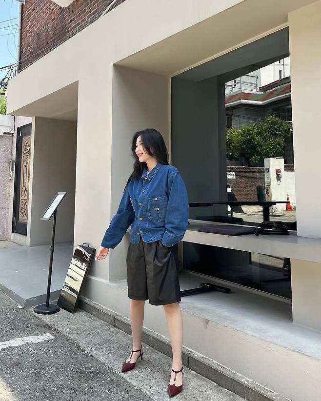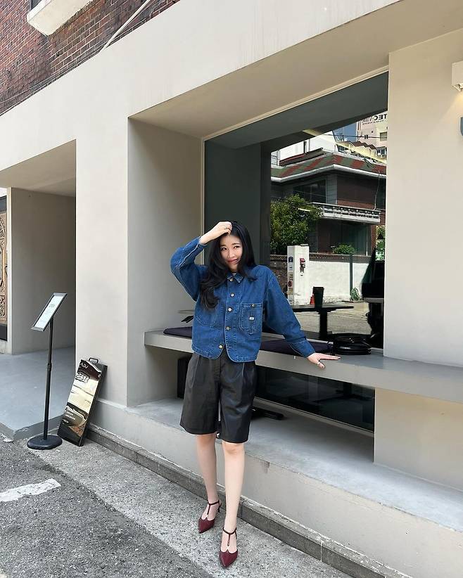 사진 속 이해리는 크롭 청 자켓을 입고 5부 가죽 팬치와 와인색의 힐을 신어 캐주얼한 데일리룩을 선보였다.