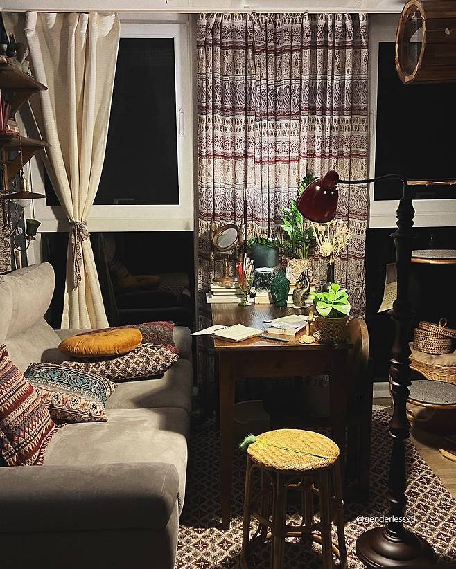 어떻게 하면 공간의 무드를 해치지 않으면서도, 센스 있게 패턴을 활용할 수 있을지 고민 중이라면? 🤔 @casa_de_oze 1집러의 공간에 집중! 아늑하면서도 조화로운 분위기가 느껴지는 특별한 구석을 소개할게요. 전체적인 톤을 통일하고, 작은 기하학 패턴의 스툴과 러그를 포인트 아이템으로 활용해 다채로운 거실 스타일링을 완성했어요. 보기만 해도 푹신함이 느껴지는 저 스툴, 한 번 앉아 보고 싶은데요?! 🤎
