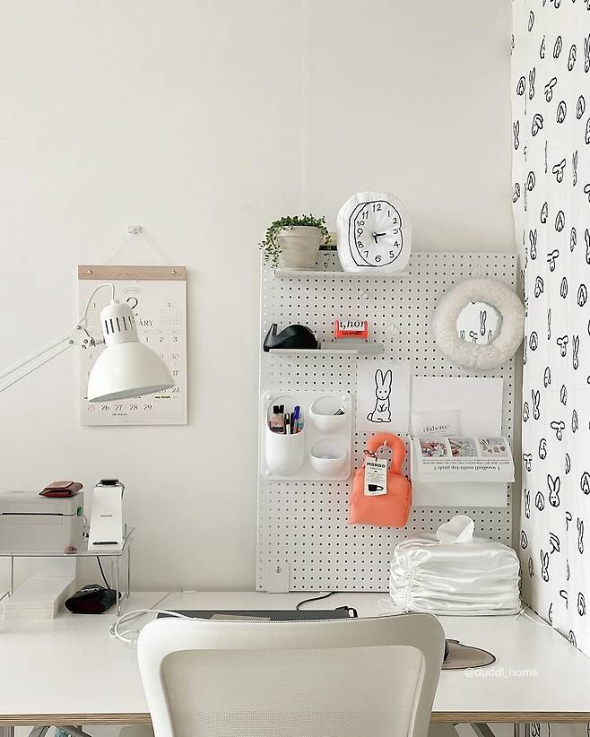 작업 공간과 부엌 사이 귀여운 패브릭을 달아 둔 @duddl_home 1집러! 귀를 이리저리 접는 토끼의 활기찬 모습을 담은 패턴 패브릭인데요. 이처럼 원룸 공간을 분리하고 싶을 때, 한 곳에 패브릭을 걸어 둔다면 마치 두 개의 방이 있는 것처럼 연출할 수 있죠. 뿐만 아니라 옷장, 선반과 벽의 자국 등... 숨기고 싶은 나만의 비밀 스폿을 살며시 가려 주는 역할도 톡톡히 해낸답니다.👍