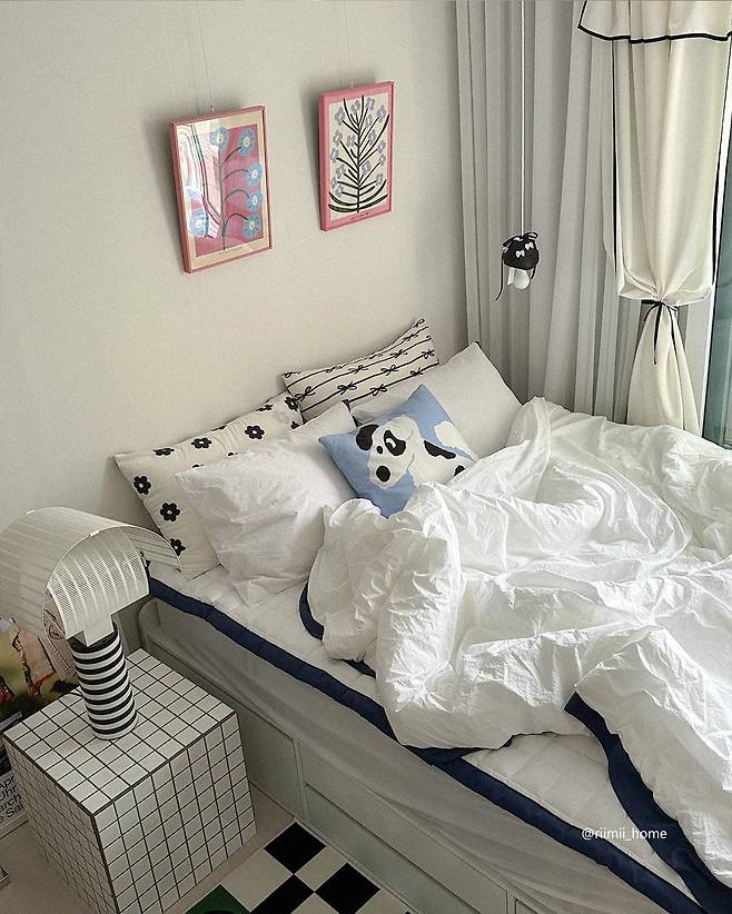 체크, 플라워 패턴 등 침실 이곳저곳에 여러 패턴 아이템들이 보이지만, 어느 하나 어색함 없이 잘 어우러져 있는 특별한 구석이에요. 😯 특히, 테이블 위에 있는 조명이 눈에 띄는데요. 블랙과 화이트 조합의 스트라이프로 절제되면서도 시원한 무드가 눈에 띄죠. 두 전등갓의 각도를 조절하여 때로는 밝게, 때로는 무드 있게 조도를 바꿀 수 있다고 해요. 모노 톤의 스트라이프 패턴으로 유려한 매력을 발산하는 이 아이템, 저도 탐나는데요… 😏💸