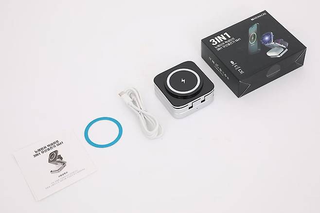 구성품으로는 뉴에이커 3IN1 접이식 맥세이프 무선충전기 본체와 USB 케이블, 접착식 메탈링, 그리고 사용 설명서가 기본 제공되고 있다.