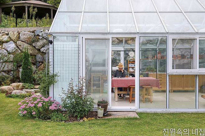 마당의 포인트 중 하나인 온실은 10평 정도로 여유있게 만들었다. 온실 입구에는 데크를 조성해 바베큐 등 다양한 활동을 즐길 수 있게끔 했다.