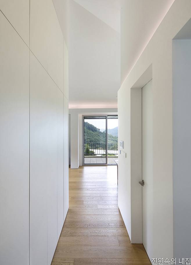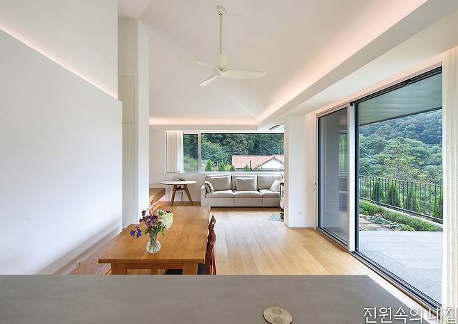 집은 심플한 구조 속 내외부가 자연스러운 흐름으로 교류할 수 있도록 구성되었다. 현관에 들어서면 높은 천장과 함께 슬라이딩 창에 담기는 북쪽 풍광이 발길을 인도한다. 복도 끝에 다다르면 동서로 길게 이어지는 주방과 거실이 시원한 개방감과 함께 나타나고, 공간을 두르는 가로창과 코너창이 대지를 에워싼 산세를 파노라마로 담는다. 동쪽 주방 너머로는 건축주의 손길로 항상 깨끗하게 관리된 모습의 정원이 펼쳐진다. 다용도실에 외부 출입구를 두어 정원으로 바로 통하도록 동선을 고려했다. 여기에 콤팩트한 침실과 넉넉한 욕실이 더해져 주말 주택으로서 더할 나위없이 충분한 집의 모습을 보여 준다. 누군가는 집을 지으면 10년은 늙는다고 말하지만 건축주는 아니었다. 진심을 가진 사람들과 한 땀 한 땀 정성을 다해 완성해가는 과정이 즐거웠다는 건축주와 사무소 구체. 입주하고 1년이 지난 지금, 단정하고 겸손한 모습으로 유지되고 있는 집과 정원에서 건축주의 열정과 애정이 묻어난다.
