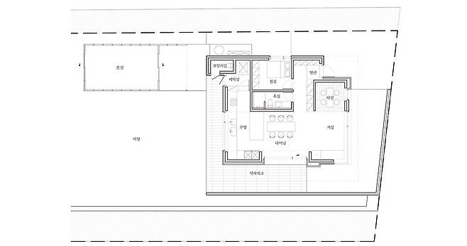 직사각형 형태의 대지 위, 정사각형의 주택 앞으로 널찍한 마당이 펼쳐진다.