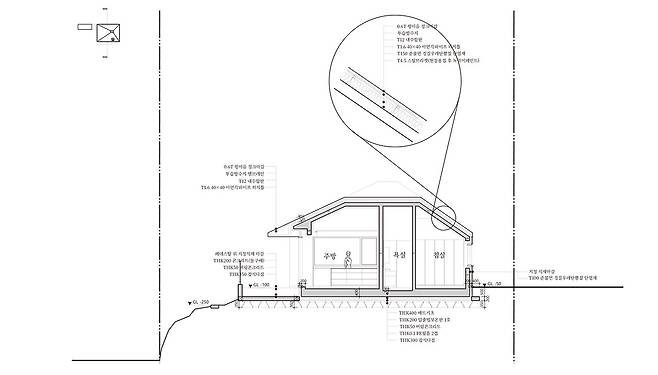 미팅을 진행하며 초기의 구조와 내부 구성은 조금씩 변경되었다. 우선 주말 주택임을 고려하여 편리한 관리와 안전을 위해 경량목구조에서 철근콘크리트구조로 설계를 변경했다. 또한 생활의 편의를 위해 다락을 생략했고, 집의 중심을 잡아주는 지붕의 형태를 그대로 살려 실내에서도 입체적인 공간감을 느낄 수 있도록 천장을 계획했다. ‘사무소 구체’는 시공도 함께 진행하면서 특히 지붕과 천장의 건축적 완성도를 높이기 위해 심혈을 기울였다. 이러한 변경은 건축면적과 예산에 큰 영향을 주는 요소들이었지만, 건축주와 건축사사무소가 서로 긴밀하게 소통한 결과이기 때문에 살면서 매우 만족한다고 건축주는 말했다.