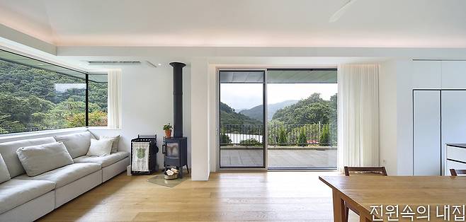 슬라이딩 도어와 코너창을 통해 아름다운 경관이 그림처럼 담긴다. 건축주의 요청 사항 중 하나였던 벽난로가 거실 한쪽을 채운다.