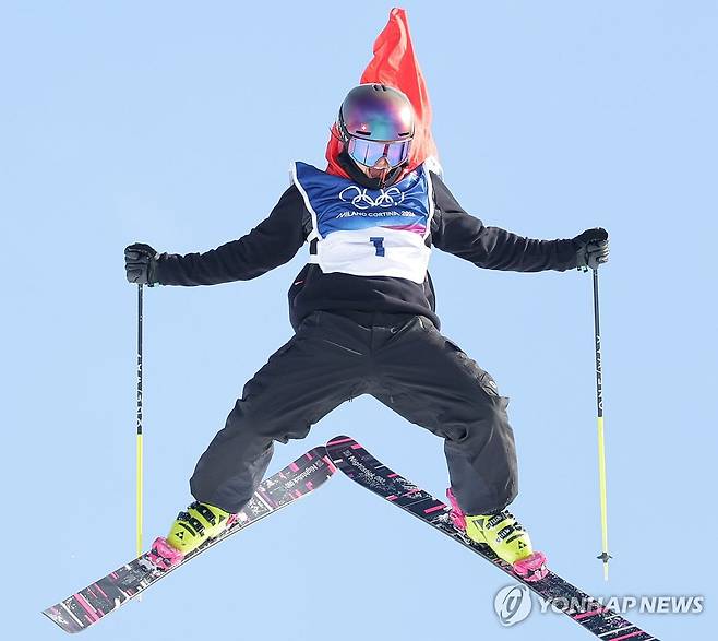 (리비뇨=연합뉴스) 류영석 기자 = 9일(현지시간) 이탈리아 리비뇨 스노파크에서 열린 밀라노·코르티나 동계 올림픽 프리스타일 스키 여자 슬로프스타일 결선에서 금메달 획득을 확신한 스위스 마틸데 그레몽이 마지막 점프를 하며 환호하고 있다. 2026.2.9